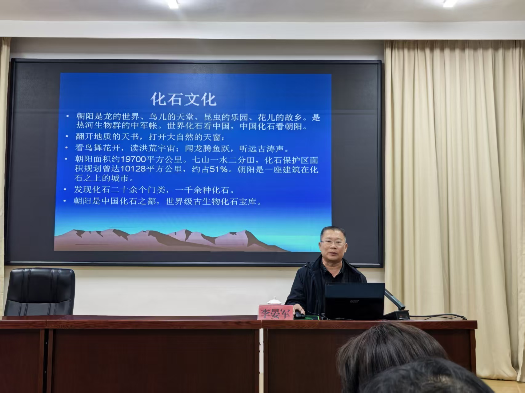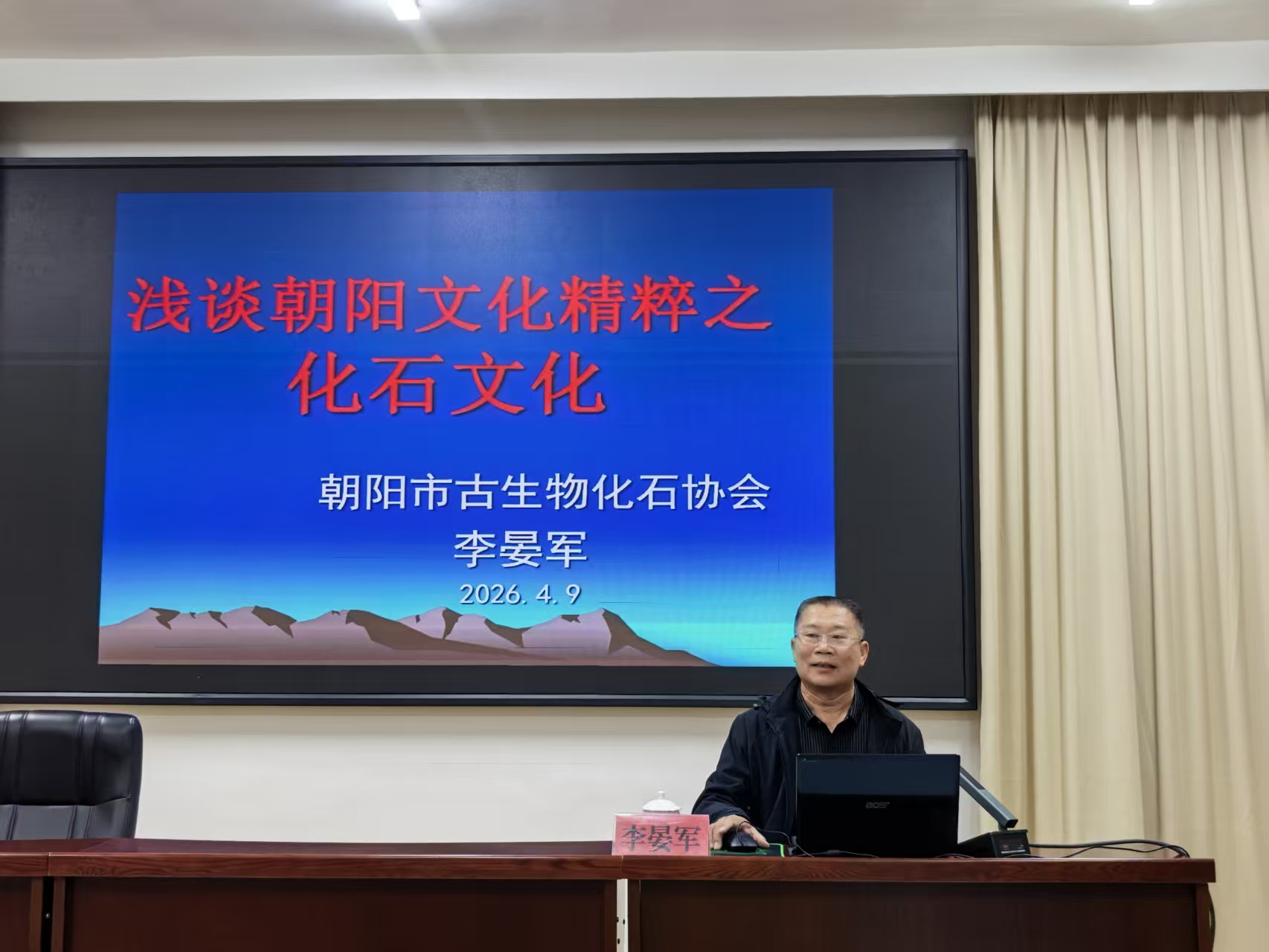 讲好朝阳化石故事,化石文化进校园。2026年4月9日,受朝阳开放大学邀请,朝阳市古生物化石协会会长李晏军做了一场题为《浅谈朝阳文化精粹之化石文化》的讲座,讲座近两个小时,近百余位教职员工参加。